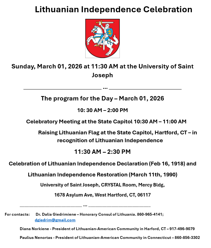 Back to All Events Lithuanian Independence Celebration Sunday, March 1, 2026 10:30 AM 2:30 PM Google Calendar ICS